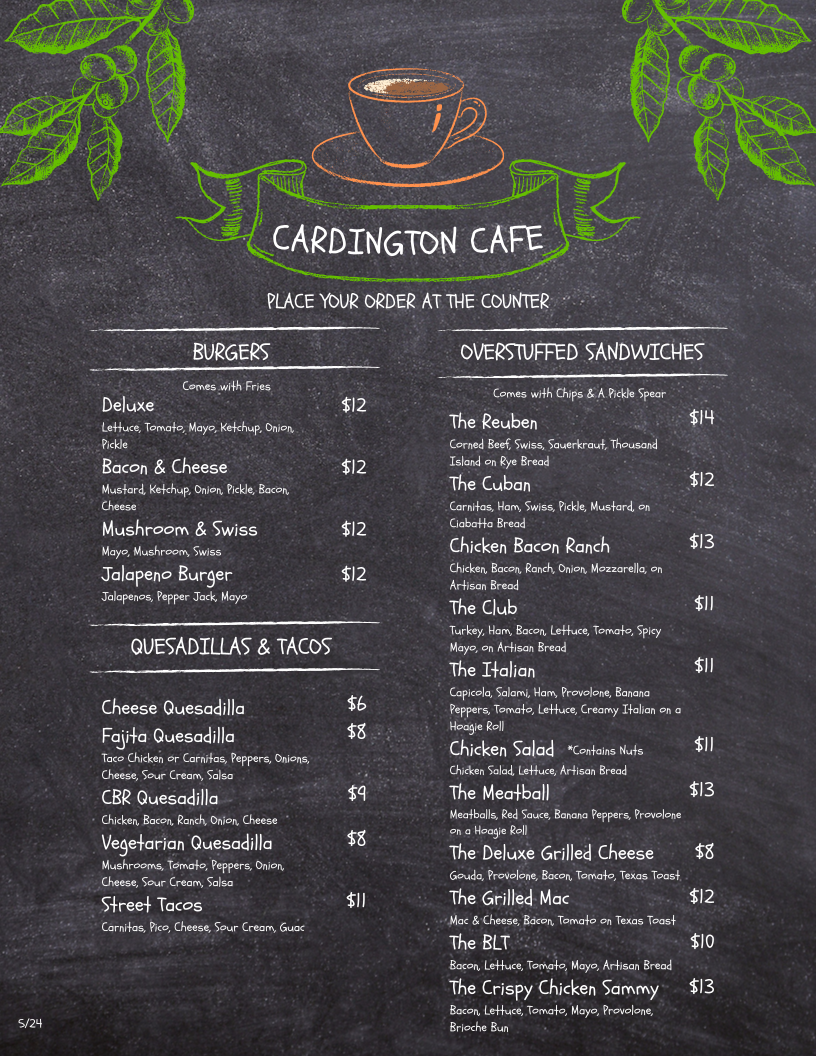 Cardington Cafe offers a diverse and hearty menu that caters to a variety of tastes. For burger enthusiasts, options like the Deluxe Burger, Bacon & Cheese Burger, Mushroom & Swiss Burger, and Jalapeno Burger promise to satisfy cravings. The Overstuffed Sandwiches section features generous choices such as The Reuben, The Cuban, Chicken Bacon Ranch, The Club, and The Italian. For a lighter meal, the Cheese Quesadilla, Fajita Quesadilla, CBR Quesadilla, and Vegetarian Quesadilla are perfect options, along with Street Tacos. The Soup & Salad section offers comfort with Soup of the Day, Soup & Salad Combo, and classic salads like the Caesar and Café House Salad. For larger appetites, dive into Chicken Parmesan or Spaghetti & Meatballs under Big Plates. The Kids Plates menu includes familiar favorites like Chicken Tenders, Mac & Cheese, and Grilled Cheese. Shareable snacks like the Charcuterie Board, Loaded Tots, and Loaded Mac & Cheese are ideal for groups, while sides such as Kettle Chips, Applesauce, French Fries, and Mac & Cheese complement any dish. Breakfast options are available all day, with choices like the Breakfast Burrito, Breakfast Bowl, and Breakfast Platter, alongside classic sides like Tots, Sausage, and Bacon. Sweet treats like Cinnamon Roll, Cookies, and Coffee Bundt Cake round off the meal. The variety and quality of the menu make Cardington Cafe a go-to spot for a satisfying meal at any time of day.
